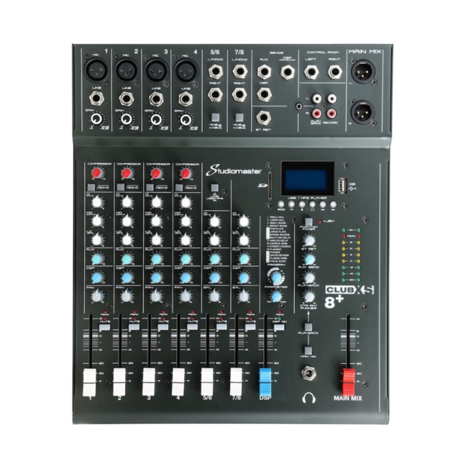 The Studiomaster Club XS 8 Compact Mixer features 8 inputs with 4 microphone channels and 2 stereo channels, along with 16 built-in DSP effects and USB/SD card compatibility. The built-in MP3 player and Bluetooth connectivity are ideal for playing background music during intervals while the USB and SD card functions allow you to directly record your performance. Complete with balanced XLR main outputs, a 3-band EQ, compressor control and high-quality 60mm faders, the Studiomaster Club XS Mixer is perfect for both home studio recording projects and live performances alike.