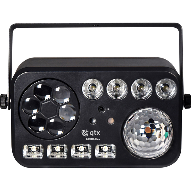 A lightweight 6-in-1 light effect combining a range of colourful GOBOs, 10W RGBW magic ball, 4x White Strobe/UV LEDs, 4x 4W RGBW PARs and Dual colour Laser in one convenient fixture. Easy to setup and use via an array of integrated automatic programs or sound to light. More precise control is provided via either 16-channel DMX connection or the included IR remote control.