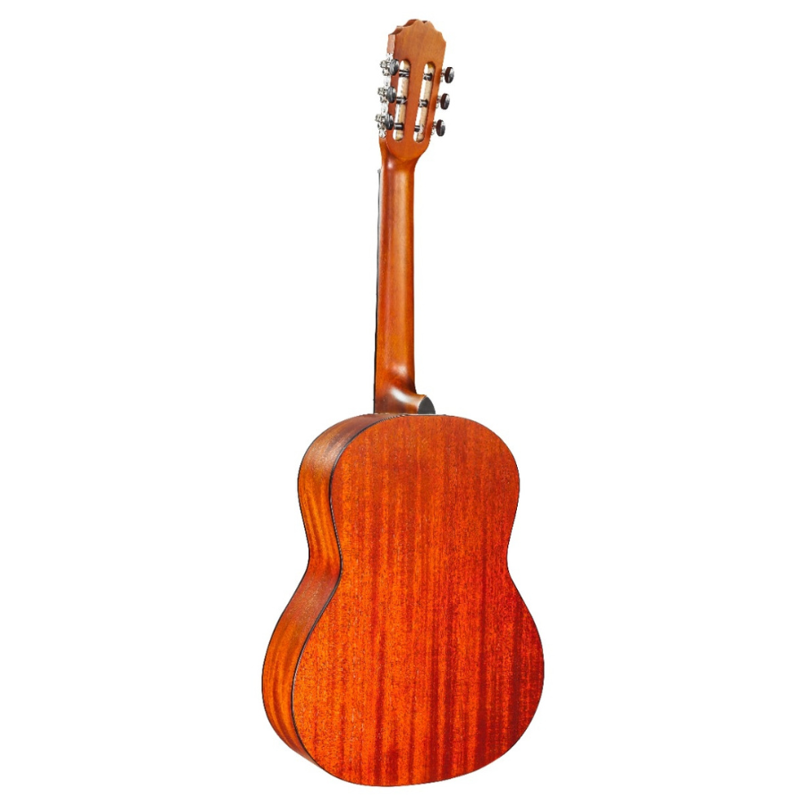 Built with a spruce top and mahogany back and sides, this guitar provides clear projection and rich tonal depth, ideal for both practice and performance. Its 3/4-size body ensures a comfortable playing experience for children aged around 8–11 years or for players who prefer a more compact instrument. The slim neck profile and smooth gloss finish make fretting and finger movement effortless, while the nylon strings are gentle on beginner fingertips.