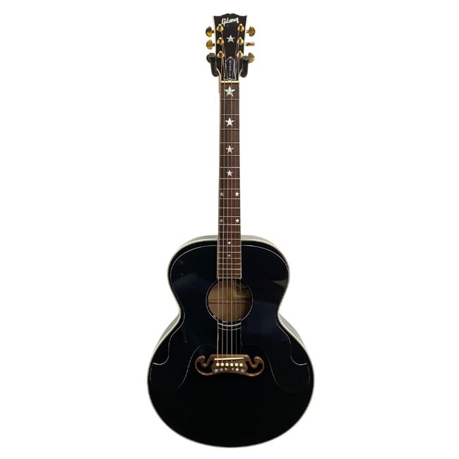 This guitar is a 1994 Gibson “The Everly” J-180, a modern reissue of the Everly Brothers’ famous black acoustic jumbo. It features the classic small-jumbo body, star inlays on the fingerboard, and a moustache bridge with star inlays—matching the limited 1994 Anniversary-spec Everly models.