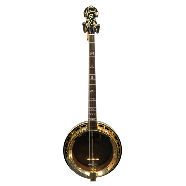 The instrument showcases detailed craftsmanship, including decorative fretboard inlays, an engraved armrest, and a classic Ozark headstock design. Built as part of Ozark’s well-regarded mid-range range, this banjo offers excellent playability and tone for intermediate players or advancing beginners.