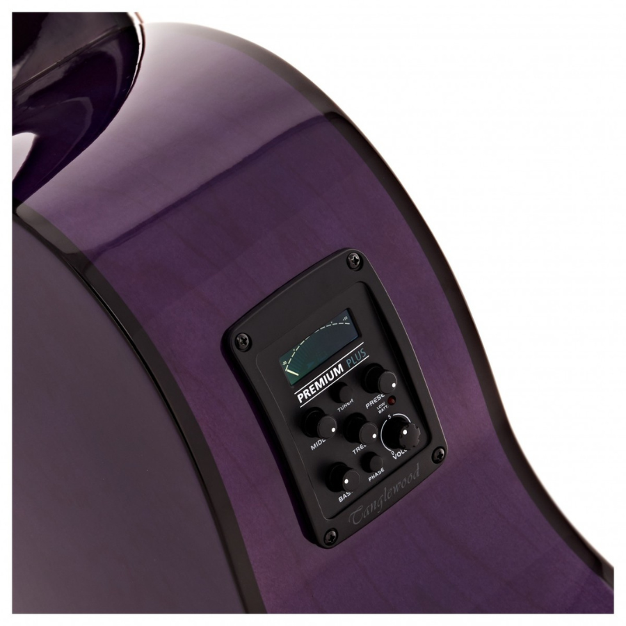 Crafted with maple back and sides, the TA4CE Azure produces a warm, balanced sound, perfect for both studio recording and live performance settings. The Purple Heart wood utilized for the fingerboard and bridge not only adds elegance but also enhances durability and tonal characteristics. Featuring the Tanglewood Premium Plus EQ system, this guitar enables precise tonal adjustments and delivers a natural amplified sound.